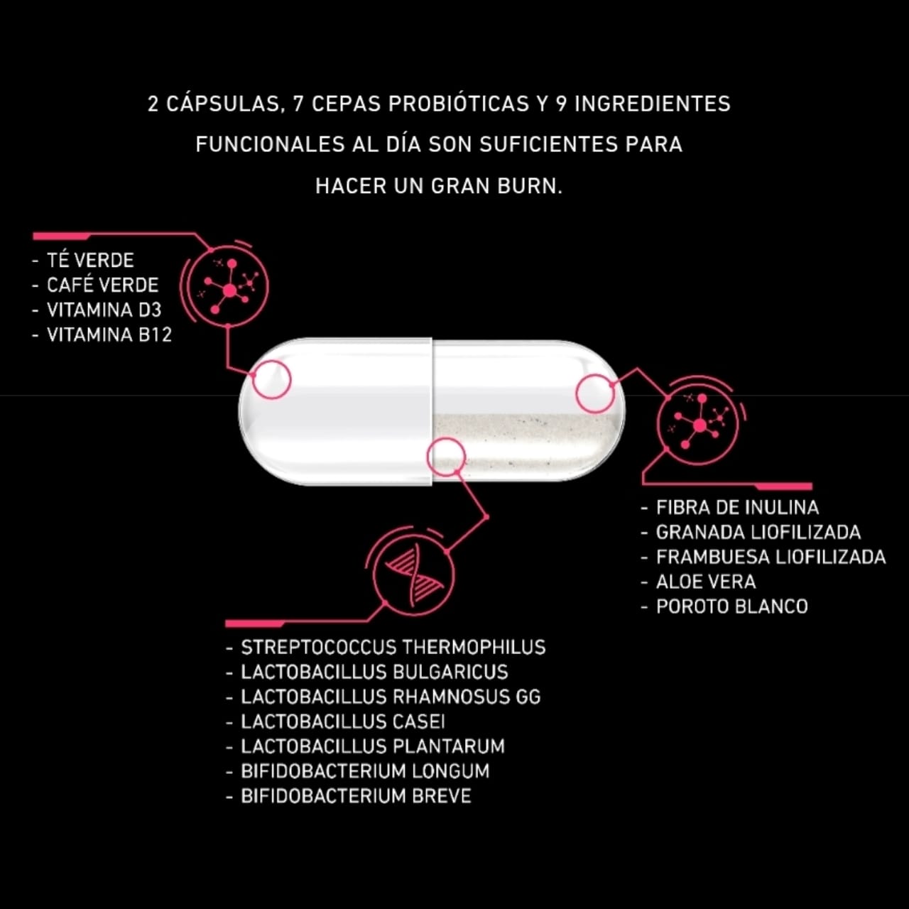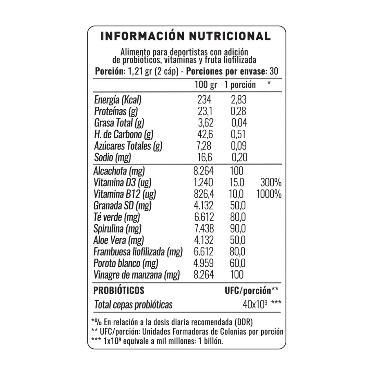 Ayuda a regular el peso corporal: Favorece el equilibrio de la microbiota intestinal, clave para un metabolismo saludable. Estimula el metabolismo y la quema de grasa: Combinación única de probióticos y extractos naturales como el té verde, vinagre de manzana y spirulina. Potencia los resultados de la dieta y ejercicio: Ideal como complemento para rutinas de control de peso. Fortalece el sistema digestivo e inmune: Gracias a sus 40 mil millones de probióticos y componentes antioxidantes. Contiene vitaminas esenciales: Aporta Vitamina B12 y D3, esenciales para la energía y función inmunológica. Fórmula con respaldo de inteligencia artificial: Diseñado por el sistema “SPHERA” basado en estudios de microbiota en Chile. Ingredientes naturales con múltiples beneficios: Granada, frambuesa, alcachofa y poroto blanco entre otros. Modo de uso Consumir 2 cápsulas al día, 20 minutos antes de cada comida. No mezclar con líquidos caliente Composición Principales ingredientes activos: Probióticos (40 mil millones): 7 cepas incluyendo Lactobacillus rhamnosus GG, Bifidobacterium longum y Lactobacillus casei. Spirulina Vitamina D3 (colecalciferol) Vitamina B12 (cianocobalamina) Té verde (Camellia sinensis) Granada deshidratada (FD) Alcachofa liofilizada Vinagre de manzana Frambuesa FD Poroto blanco (Phaseolus vulgaris) Lecitina de soya Otros componentes: Gelatina, maltodextrina, almidón de maíz, dióxido de silicio amorfo, aloe vera, carbonato de calcio. Presentación: Frasco con cápsulas. Precauciones: No exponer al calor ni a la luz solar directa. No apto para menores de 15 años. No reemplaza una alimentación balanceada. Contiene cafeína natural. Mantener en lugar fresco y seco.