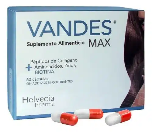 Vandes Max es un suplemento alimenticio formulado con ingredientes esenciales para estimular el crecimiento y fortaleza del cabello, las uñas y la salud de la piel. Contiene L-metionina, L-cistina, zinc, biotina y pantotenato de calcio, ingredientes claves para un desarrollo saludable.
